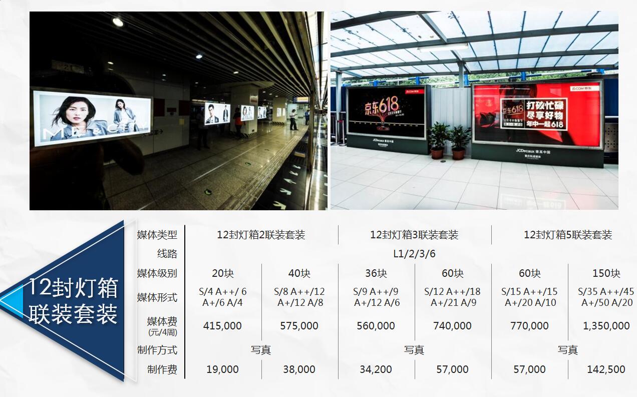 | 媒體類型:12封燈箱(3015型號燈箱) 媒體費用(元) S級:75,000; A++:55000; A+:42000; A:27000; B:21000 制作費:950元/張 ? |