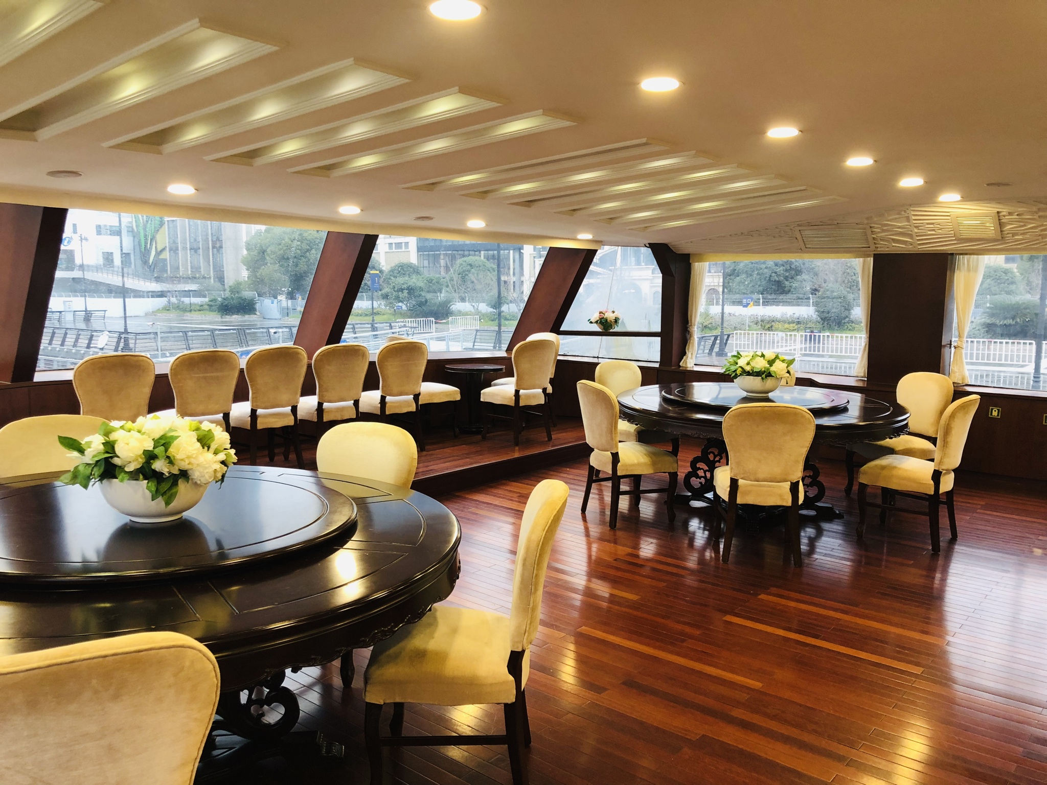 寬大的窗戶,讓風景如畫的浦江兩岸盡收眼底。三層露天甲板更是全敞開式的海天空間,在您盡享微風和美景的同時,召開甲板式的餐會,雞尾酒會或發布會可謂新穎別致。位于三層的貴賓廳讓您尊享高貴。