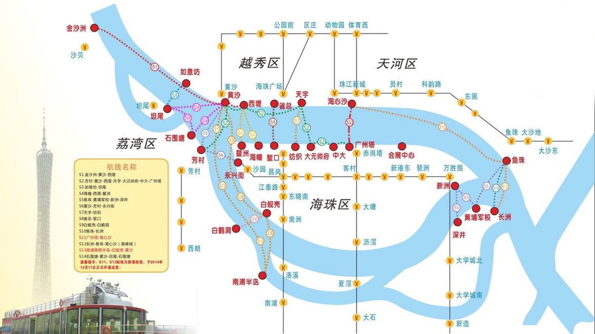 碼頭站點(23座):廣州塔、天字、中大、芳村、金沙洲、大元帥府