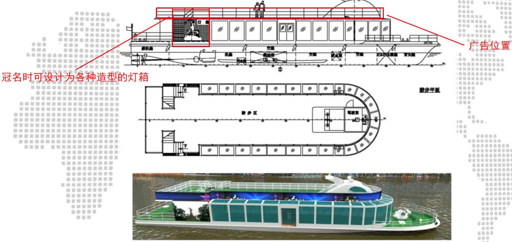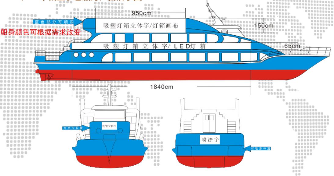 1、船舶冠名廣告(案例如下) 按照客戶的需求,結合船型特點,在游船上設置定制LED、燈箱廣告