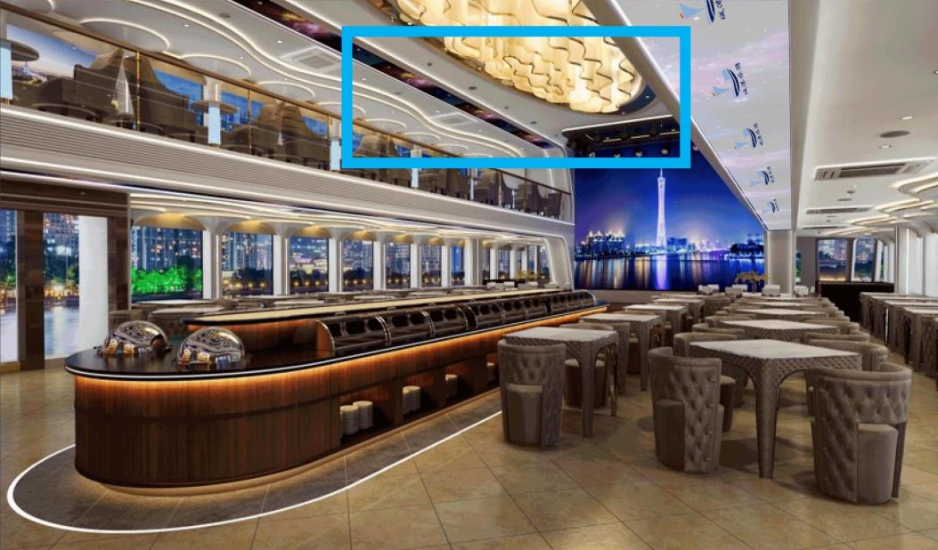 游船內部廣告位:二樓開放式坐席區(qū)兩側分布2個橫版廣告展示位