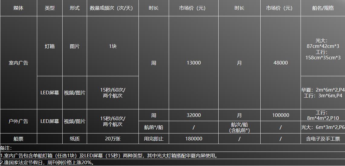 | 媒體尺寸 | 船身外側廣告字:長-7米、高-0.9米;船頭橫幅廣告位:長-10米,高-1米; 一樓內部整面廣告墻:長-3.4米,高-2.8米。 |
