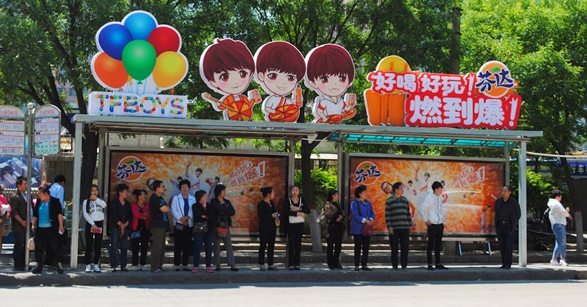 | 太原公交站牌廣告 為突出產品特色,增加廣告記憶度,借助創意特型候車亭來吸引受眾,既增加了傳統候車亭媒體發布的趣味性,同時詮釋了芬達“好喝,好玩!燃到爆!”品牌宣傳主題,成為街頭巷議的重要話題。 |