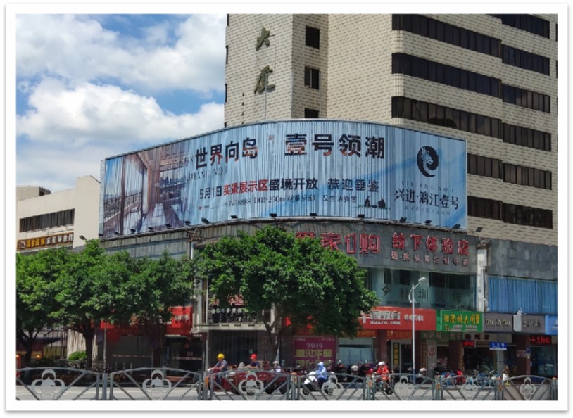此戶外廣告牌位于桂林市中心上海路,稚山立交橋旁的民航大廈墻面,每天數萬車輛從臨桂、機場、火車站,經過此地,是桂林市最擁堵的道路之一。