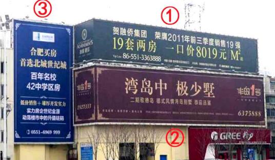 | 合肥長(zhǎng)江中路與徽州大道西北角落地大牌廣告 媒體位置:長(zhǎng)江中路與徽州大道交口西北角落地大牌 發(fā)布形式:噴繪畫面 媒體規(guī)格:40.89m×8.1m=331㎡ 媒體簡(jiǎn)介:此3塊廣告牌位于“安徽第一路”長(zhǎng)江中路與徽州大道交口西北角,是合肥城市交通主干軸,緊鄰省政府、淮河路步行街,逍遙津公園等核心區(qū)域。是企業(yè)品牌宣傳及項(xiàng)目形象展示的最佳首選。 |