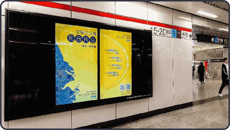 位于S級核心換乘通道梯旁,全天候高客流量零距離接觸 每側(cè)10或12塊42/32寸高精度電子顯示屏聯(lián)裝,支持多種媒體格式播放 創(chuàng)新的媒體形式,獨特的創(chuàng)意模式,體驗高效生動的信息傳達(dá)新感覺 ,更可配合大畫幅墻貼,帶來強大視覺沖擊力和品牌親切度