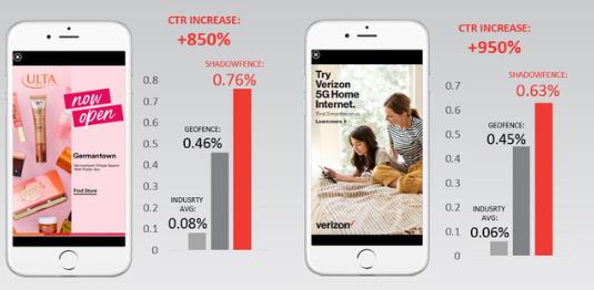 根據官方給出的數據,使用Shadowfence的廣告點擊率是行業平均值的10倍左右,比利用Geofence(地理圍欄)的廣告效果也高出20%-30%。