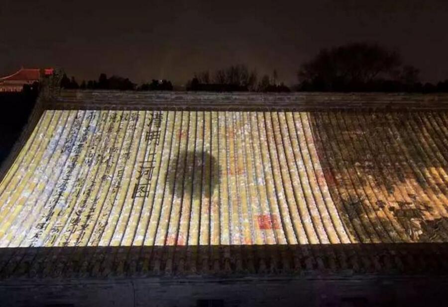 此次夜游故宮最精彩的地方,莫過(guò)于從東北角樓帶神武門(mén)的這一塊區(qū)域了。光與影將《清明上河圖》和《千里江山圖》等畫(huà)卷投影于大殿屋頂上,或如展開(kāi)的折扇,或如綠色的屏障,耳邊還應(yīng)景地回蕩著叫賣(mài)、搖櫓等聲音,古畫(huà)的意境與屋瓦融為一體,靈動(dòng)異常,仿佛人在畫(huà)中游。