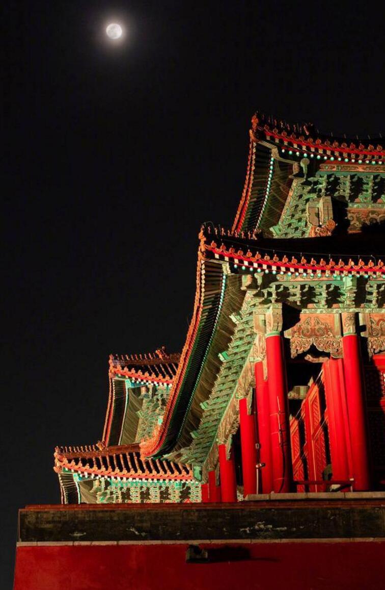 比起午門(mén)的瑰麗,太和門(mén)廣場(chǎng)顯得較為古樸。重檐之上的月光,城墻下延綿的彩燈,似乎將四周的宮殿剛剛喚醒,斑駁與浮華交織,偶有御貓從屋脊輕盈地掠過(guò)。